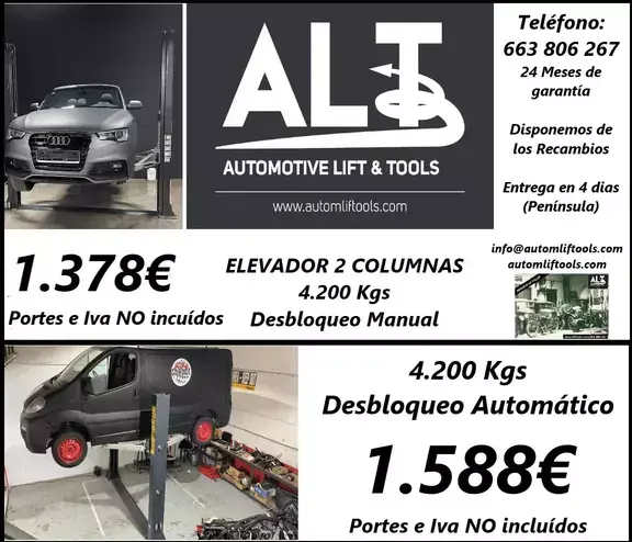 AUTOMOTIVE LIFT&TOOLS ALT es su Socio de confianza en todo lo relacionado con Elevadores de Coches y Maquinaria para Talleres Mecánicos. Con productos de alta calidad y un compromiso inquebrantable con el servicio al cliente, facilitamos soluciones que abarcan desde la venta hasta la técnica y postventa. Con entregas rápidas en 3-4 días a toda la Península, estamos aquí para satisfacer sus necesidades. Pulse el Botón inferior y tenga acceso a todos nuestros Productos y Ofertas.